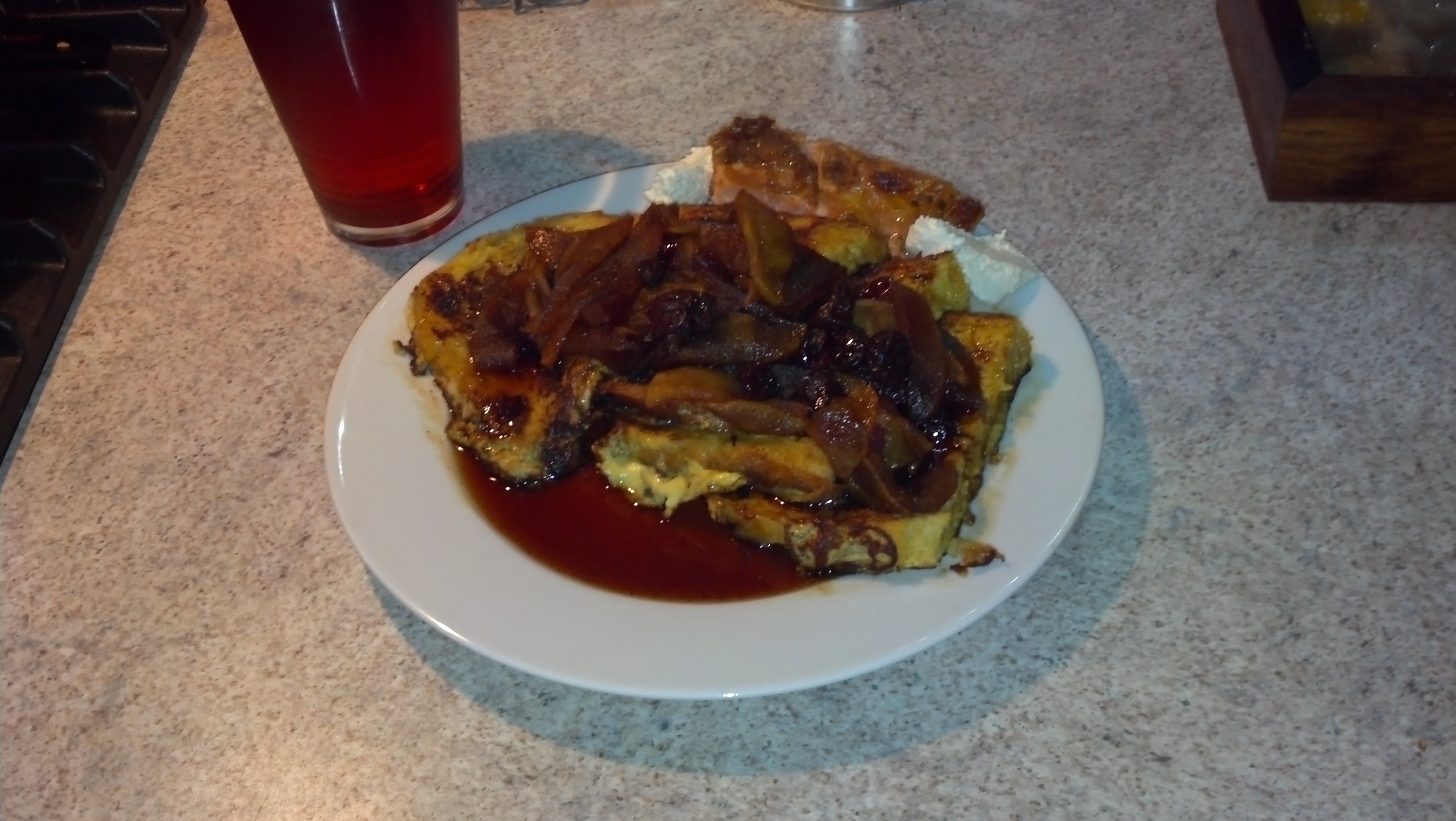 Last night, celebrating a friend’s soon to be 40th birthday, there was Patron. And tomato wine, and lots and lots of giggling like fools. After nights like these, light and healthy is not my first choice. Since I’m moving soon, I’m not buying a whole lot of new groceries outside of bread, milk and eggs. Sweet and savory on a plate is usually my first choice after a night of lots of giggles. I had some smoked salmon and parmesan cream cheese left over in the fridge, so protein and dairy were handled. There’s a couple apples in the fruit bin, so they were peeled and sliced and dropped in a pan with some nutmeg, cinnamon, and brown sugar. Back to the fridge, there’s some left over liquored fruit. dried cherries, raisins, and cranberries that had been soaking in rum for about a week. I use these as a kicker in apple pie, so I know they’ll play nice with the apples in caramel playing in the sauce pan. Brought to a boil to melt the sugar, then covered and reduced to a simmer to let that brown sugar thicken up to a syrup.