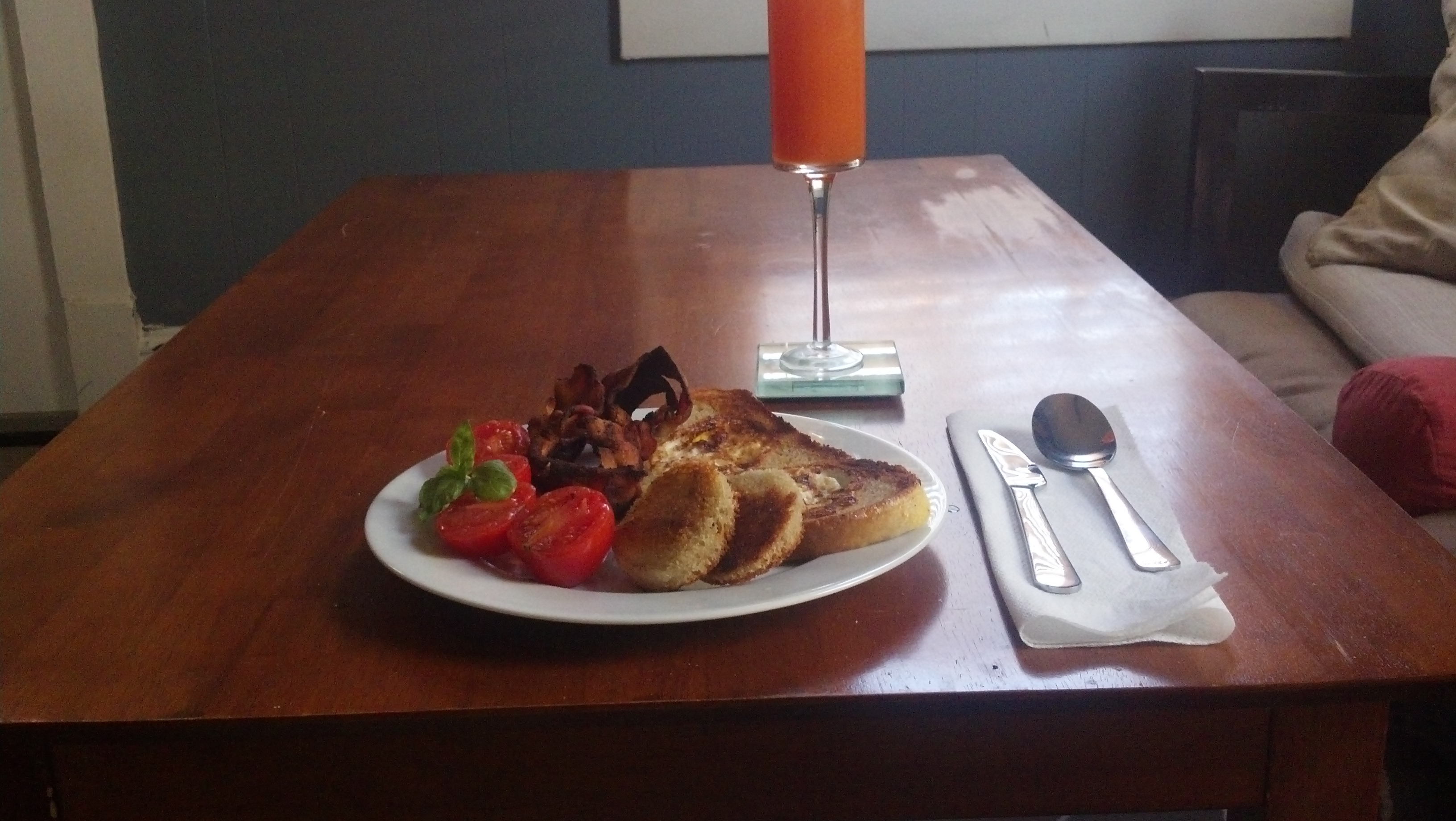So on the stovetop, I heated up one of those two-burner skillets til it smoked a little, dropped on a bit of water to bring the temperature down a little and let it steam up my kitchen. After the water bubbled off, put 4 strips of a very nice, fatty bacon down and watch the fat render. You will be using that fat, so do not remove it. Get your loaf of sourdough out and cut yourself a slice about 3/4 of an inch thick. Then get the biscuit cutter and cut two evenly spaced holes in your bread. Save the holes. Round toast is awesome. Once your bacon is about done, remove it from the griddle and drain off the fat on some kitchen paper. Place your holey bread on the griddle wherever the fat is still sitting and let the bread toast up a bit. Put the holes down there too. Now get your 2 eggs, and crack them one at a time on the flat of the counter. Cracking on the corner drives shells into your eggs and nobody likes to crunch down on a shell when in mid-nom-nom. Put the eggs in the holey bread. When the eggs are about cooked through, get your spatula and maybe a second one if that bread is really wide like mine. Slowly work under the bread being very careful not to pop the yolk and gently flip it over. Cook until it gets to your desired firmness.