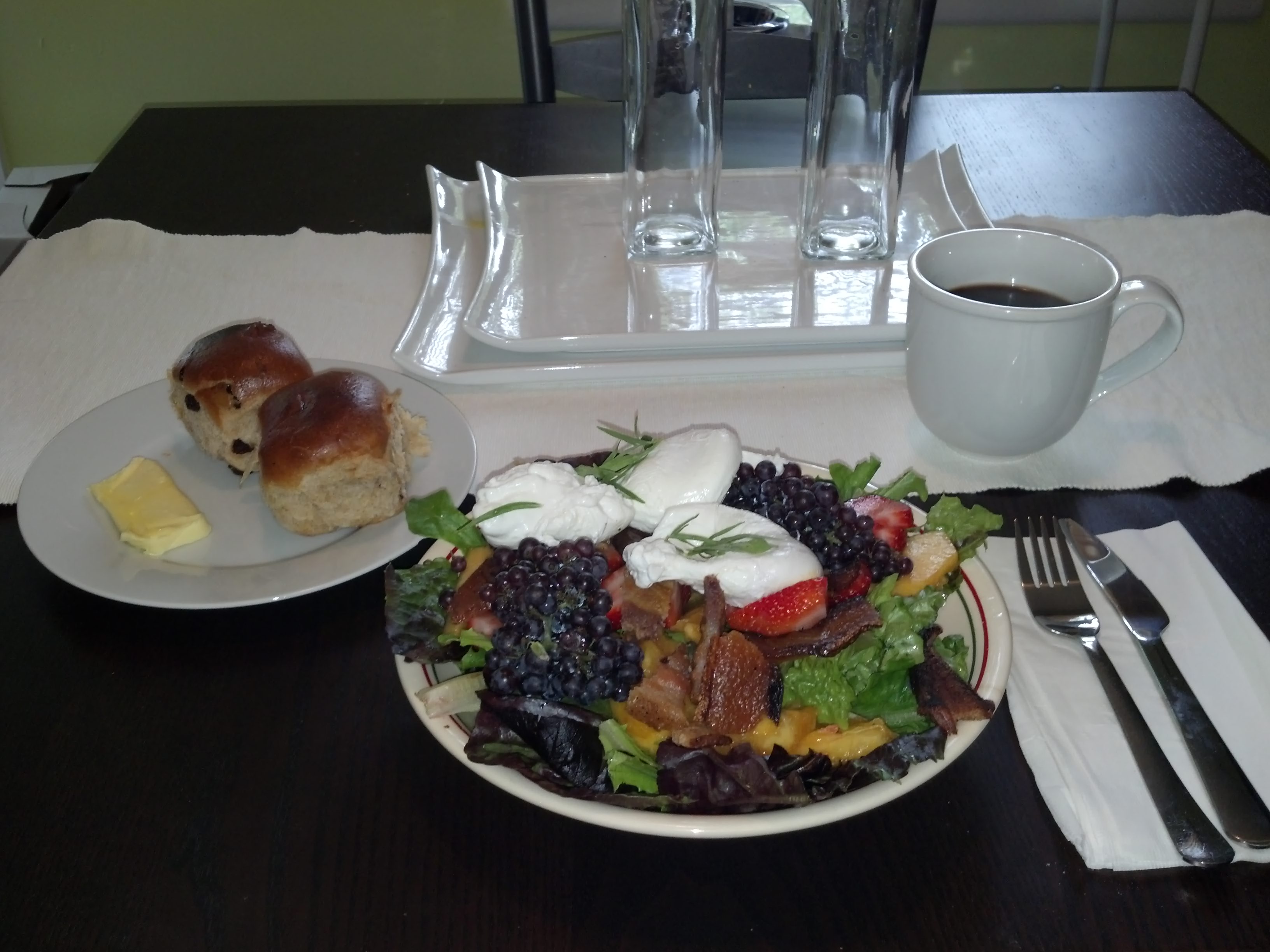 This salad is actually kind of interesting because its parts all sort of blend together and make a nice, rich dressing at the bottom of the bowl, perfect for dipping those nice cinnamon raison rolls dabbed lightly in butter.
