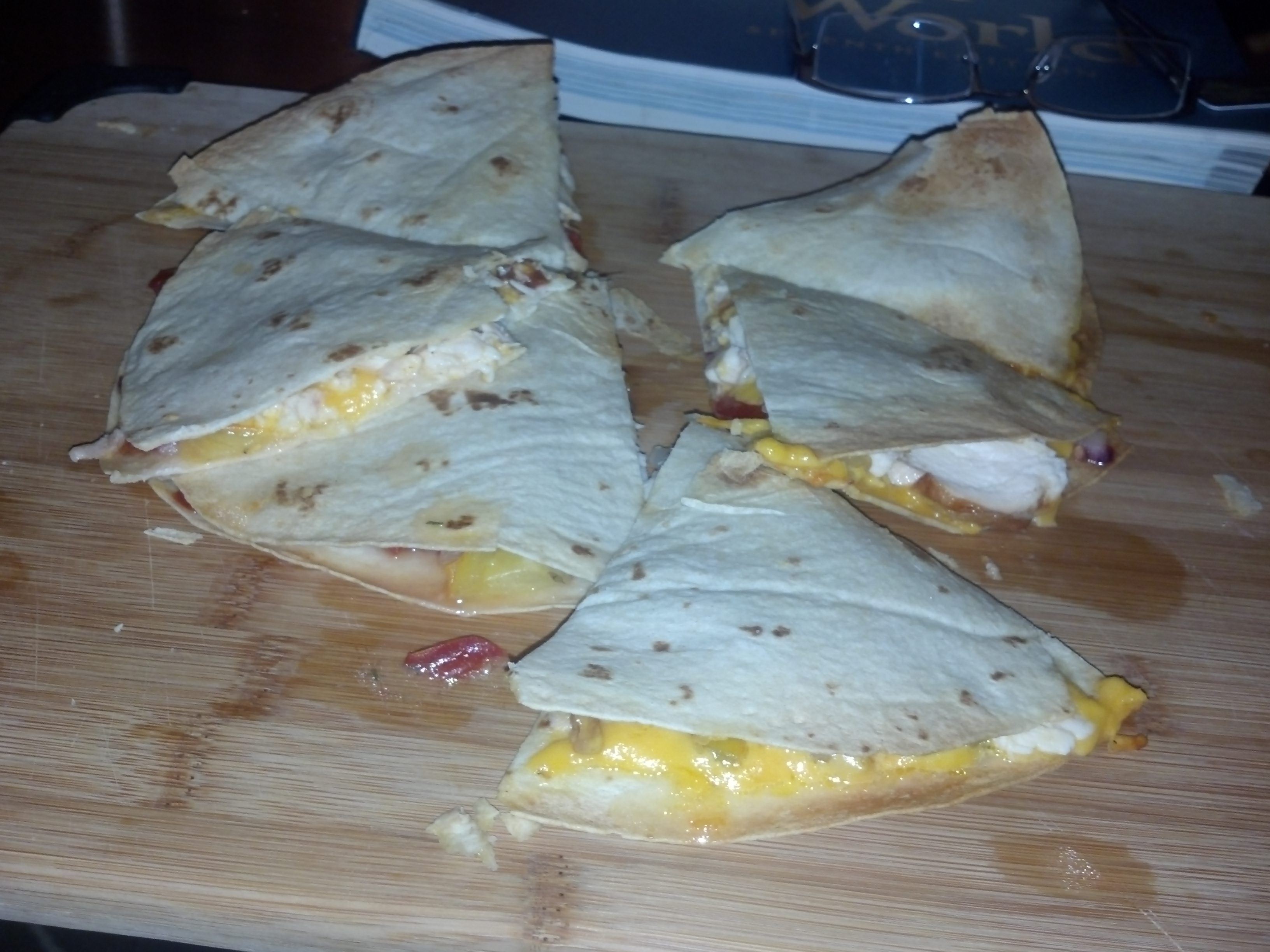 I had some leftover roast chicken, some flour tortillas, and a bit of cheddar-jack cheese grated so I built myself a very nice quesadilla. On the first tortilla, spread salsa, sprinkle cheese, slice some chicken breast thinly, add second tortilla. Put that in the oven at 400 degrees for about 8-10 minutes but keep watch over it. While that’s cooking, take some lime zest, lime juice, and sour cream and combine them to serve with your quesadillas.