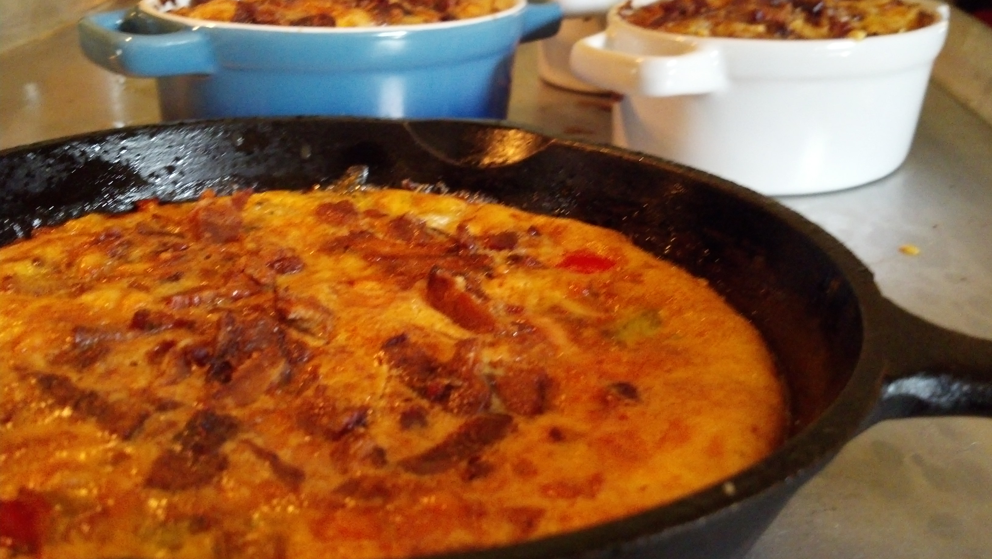 In a bowl, I cracked three eggs and added about a quarter cup of heavy cream and beat them together with a whisk. I grated about a quarter cup of gouda, and a quarter cup of manchego cheese. In ramekins and a mini-cast iron skillet, I spooned in the vegetables, poured in the egg and cream, sprinkled the cheese. and then went back to the fridge for the last of the stash of this week’s bacon. I chopped it up and sprinkled a bit on each ramekin, then a little sprinkle of cayenne pepper across the top to warm things up.