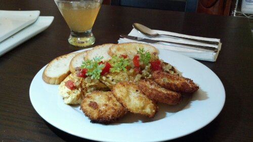 For my meal today, I made fried tomatoes, a buttermilk and gouda omelet with sauteed Serrano chilies and onion, and torta toast.