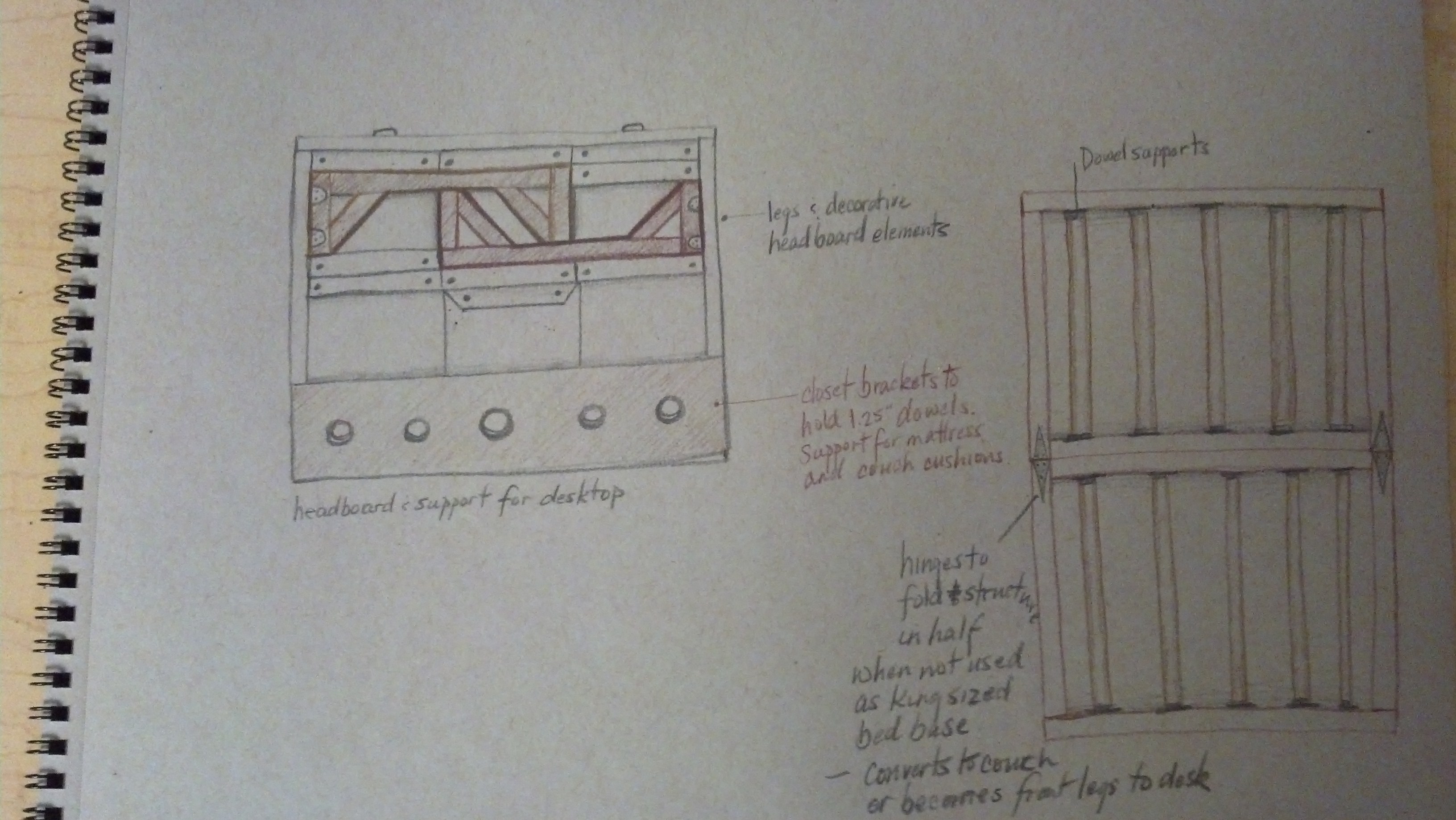 In the process of building this thing, I tried various support structures consisting of rope, d-rings, and eye hooks. They supported the mattress, but the center sag left me feeling a bit too cradled by the bed and not quite supported. Dowel rods were the second choice, but flexed when left at their full length. The best option appears to be consolidating the support into shorter dowel rods that split where the base folded. They then provide the full support for the mattresses, they also provide the same support for the day bed when the support structure is folded up.