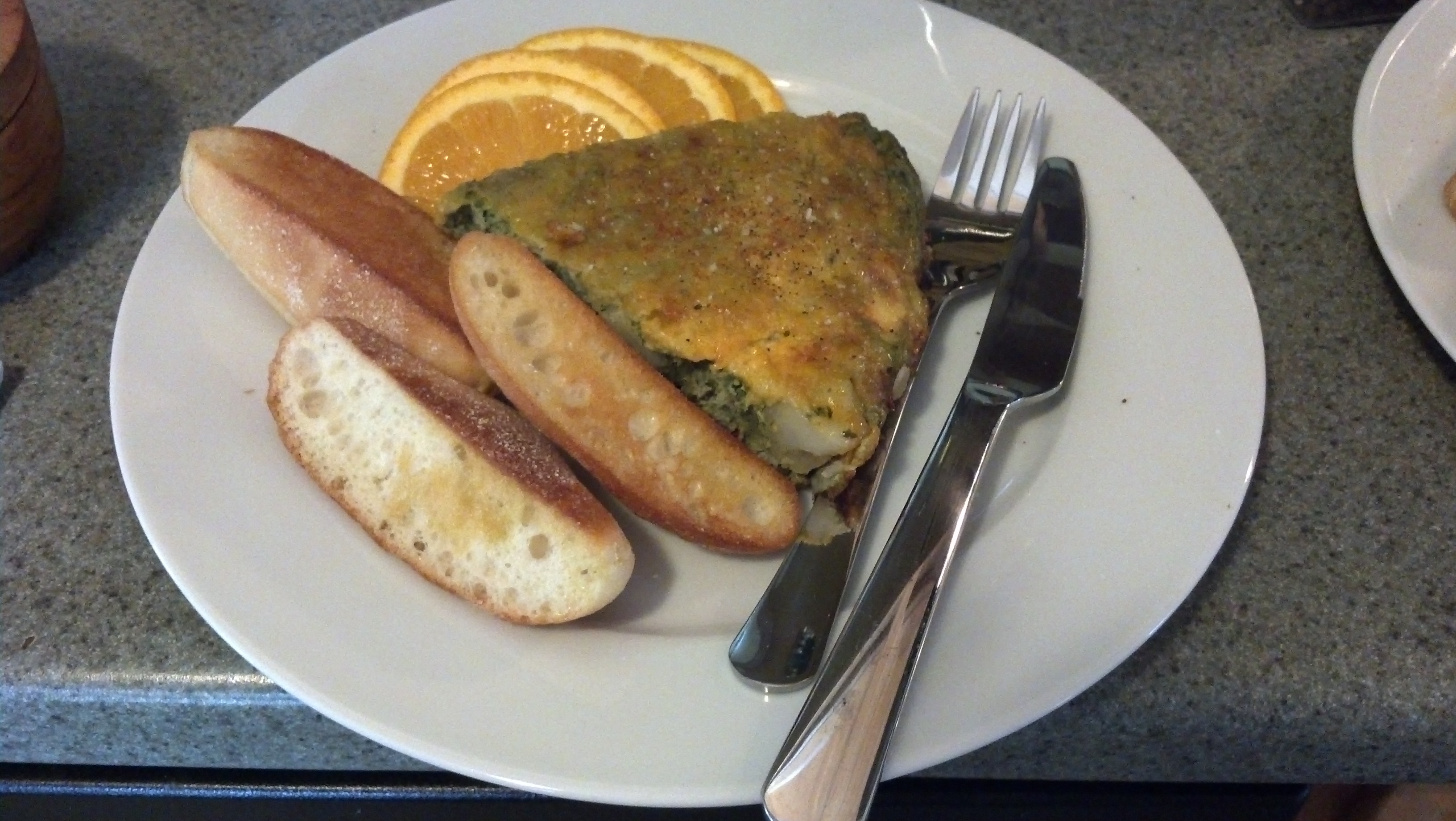 In the food processor, put the sweated-down greens in with the herbal goo a cup of heavy cream and 6 eggs. Blend until green and funny looking. Pour the green custard mixture into the skillet, preferred cast iron if you have it, and then over the top grate off some nice smoked gouda and a nice cheddar cheese (about a cup.) Bake until the cheese on top is a little brown, and the frittata can be pierced with a tooth pick that comes out clean.