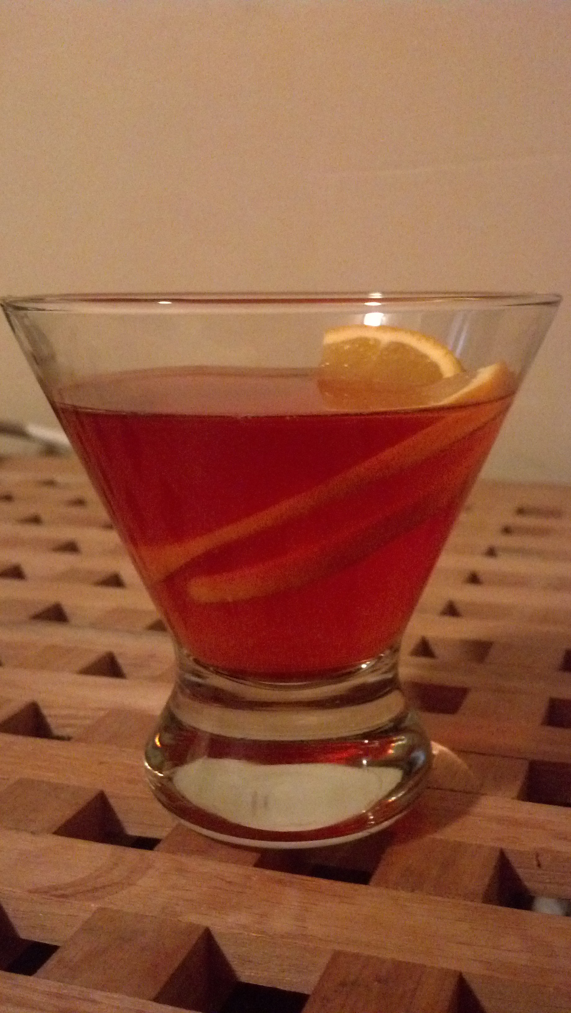 And the drink. 1 jigger Campari, 1 jigger Sweet Vermouth, 2 jiggers gin. two shakes of bitters. Orange bitters if you have them and a slice of orange.