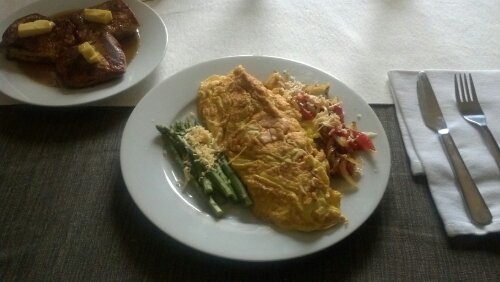 In a hot omelette pan, add butter and olive oil to coat, then pour in two eggs you have beaten with a little water. Move the edges of the omelette so the yolk gets to the hot pan and so you can be sure its not sticking. Put your tomato and onion, shredded ham and cheese, and a little salt and pepper, and gently plate your omelette with your side of tarragon asparagus. Get out your French toast on a side plate and top with a pat of butter and real maple syrup.