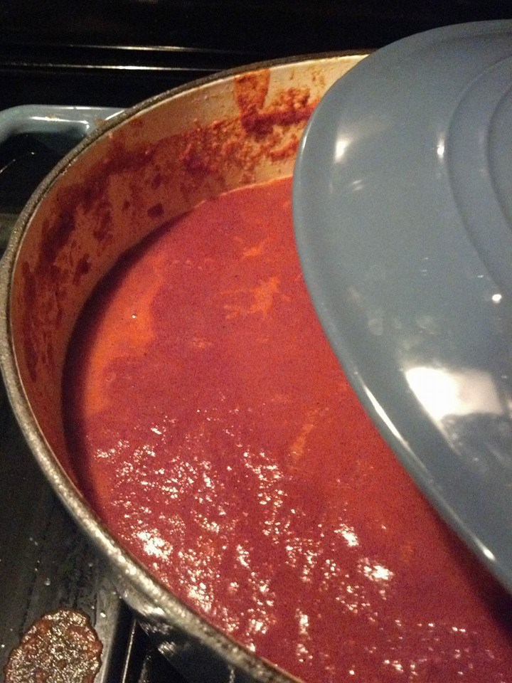 Drop the pot down to low heat and simmer for about 30 minutes. If the sauce looks too thick, add a bit of water, or if you have it, vegetable stock to thin it out a bit.