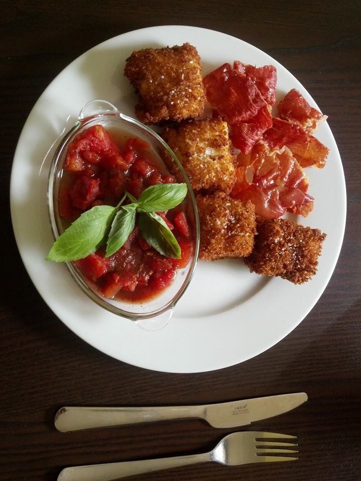 I opened a can of diced tomatoes, added a dolop of honey, some dried basil, and a few glugs of balsamic vinegar and simmered it for about 10 minutes, then picked a sprig of fresh basil to garnish.