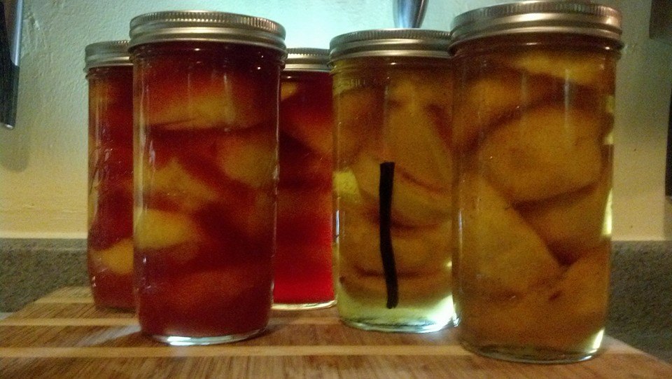 I made a second pot of syrup by taking three cups of filtered water, two cups of sugar, and a split vanilla bean, bring to a boil and reduce to simmer to allow the vanilla to infuse into the syrup. This I didn’t strain, as I wanted vanilla pods to stay in the jars.