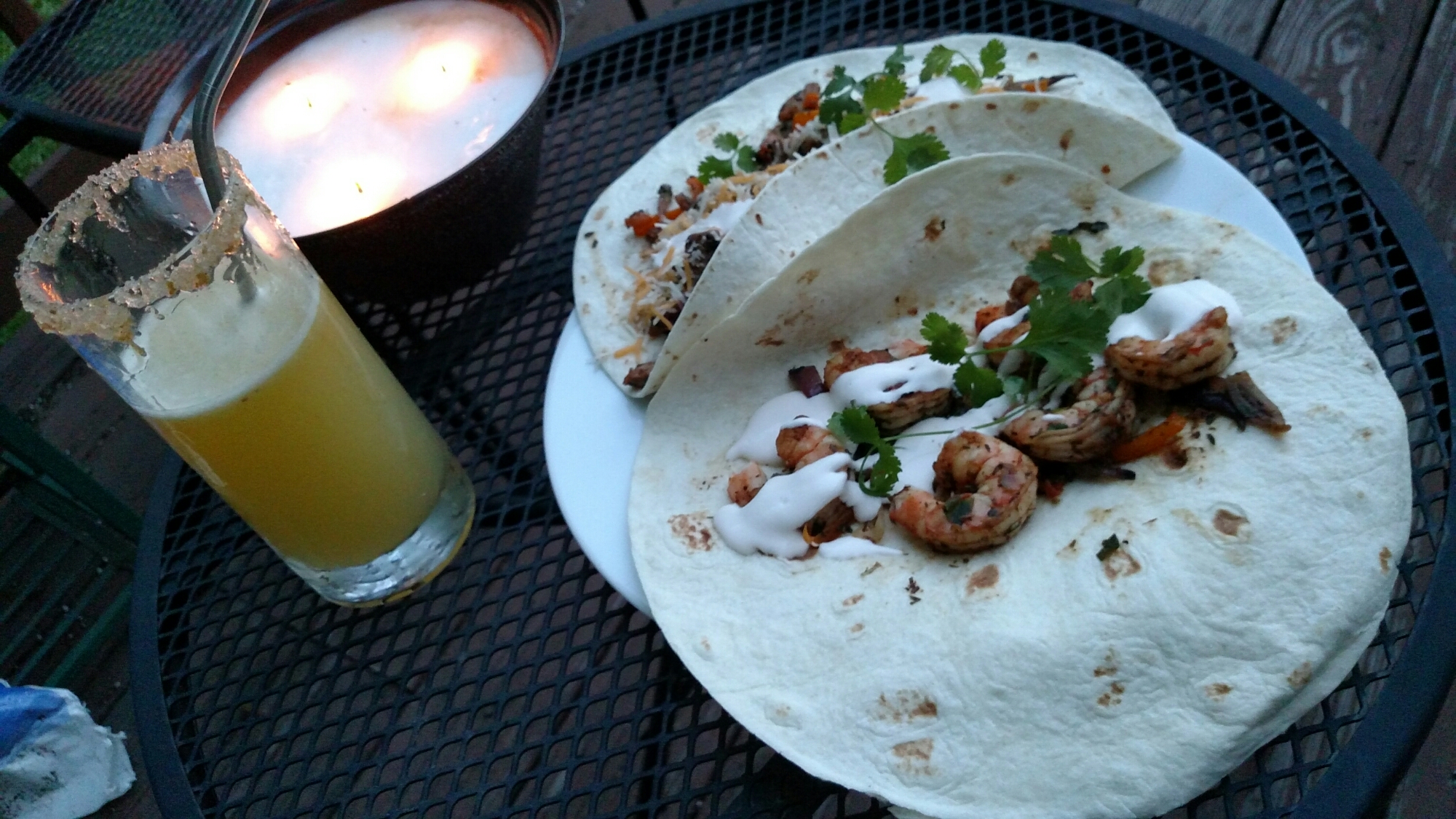Served with Steak Fajitas and Shrimp Fajitas (peppers, onion, tomato and cilantro, wilted in a cast iron skillet with bacon fat, then add shrimp and steak, seasoned with cumin, anchor chili powder, garlic powder, salt and pepper.