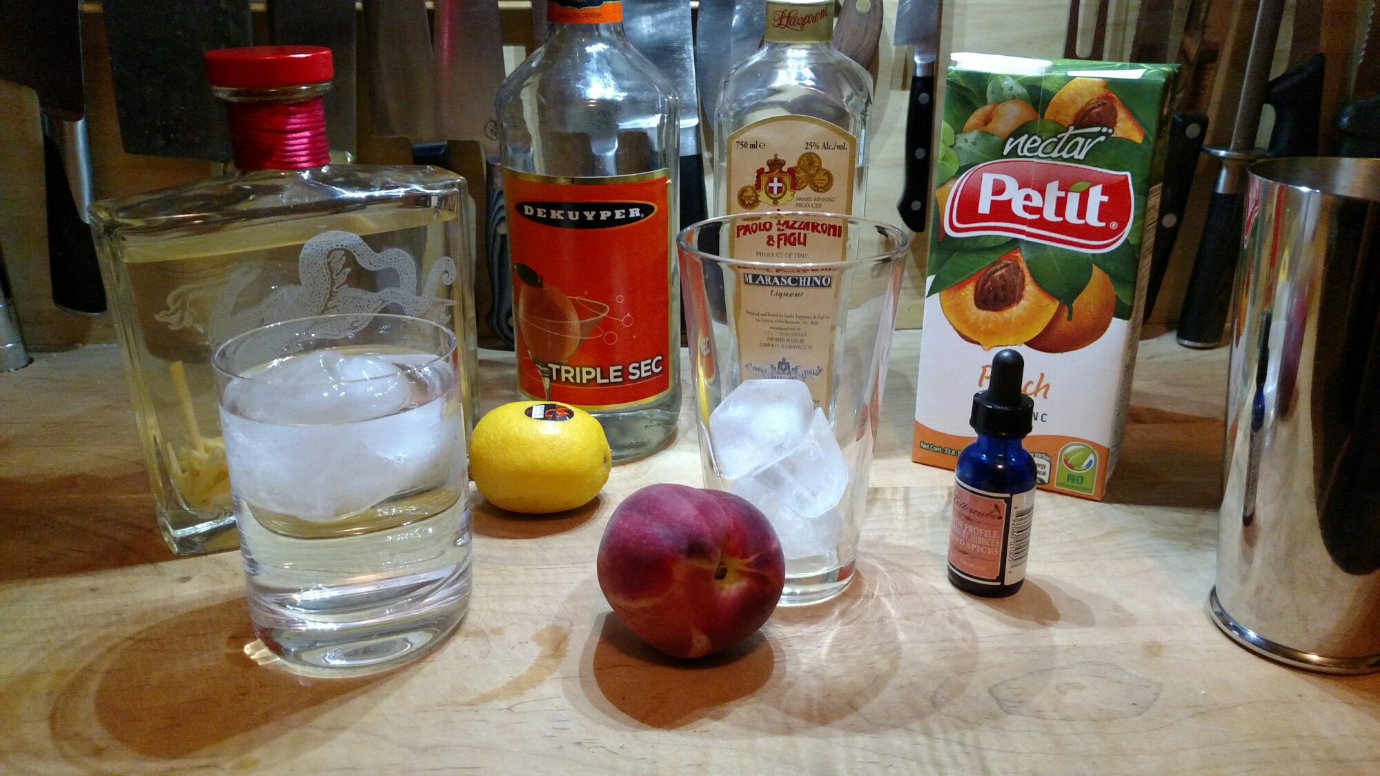 Add lemon juice and peach nectar to the shaker.