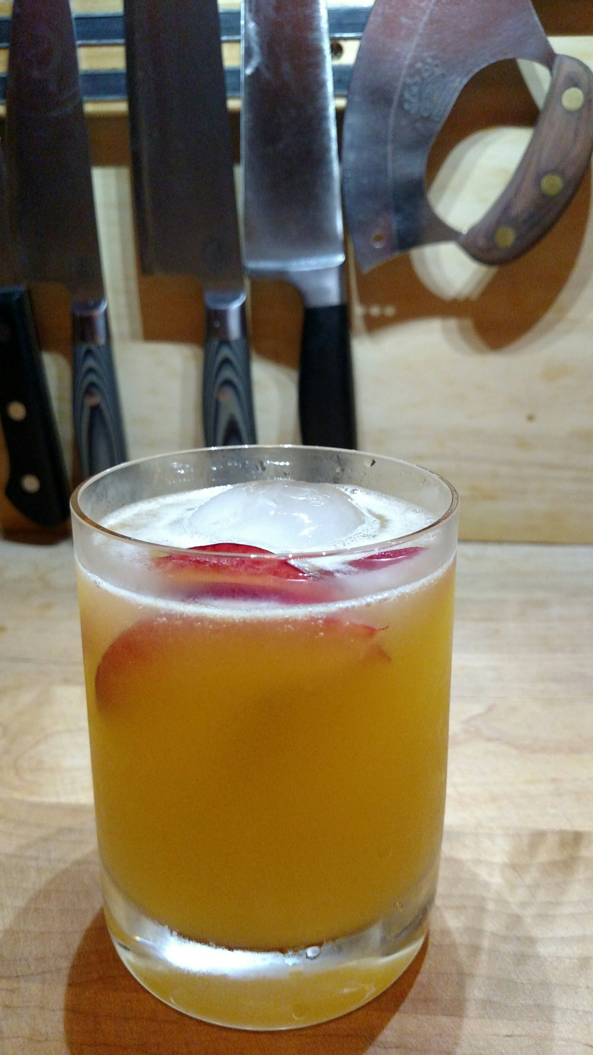 Garnish with grapefruit bitters and fresh peach slices.