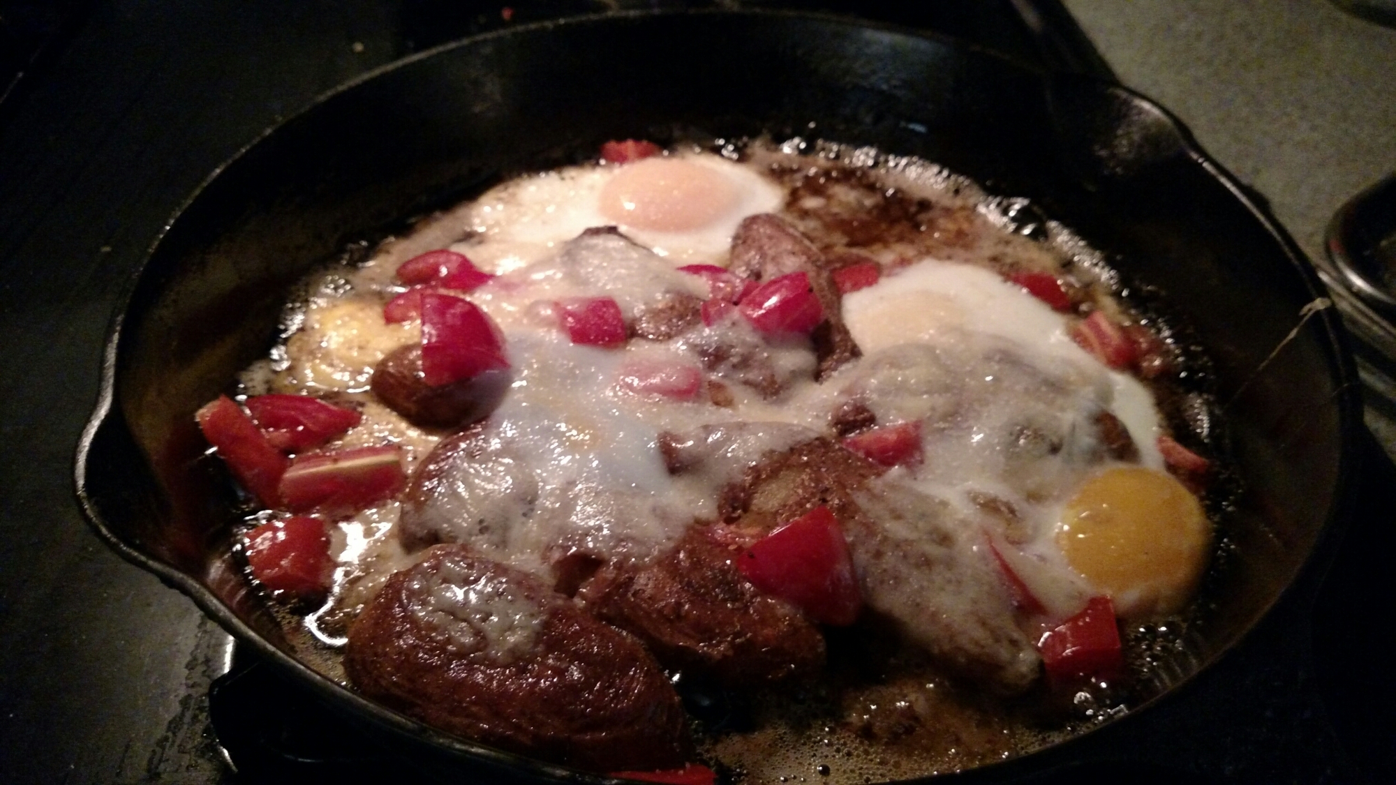 About 10 minutes before done, use a spatula to turn the potatoes, then add diced tomatoes, sliced cheddar, and break 3 eggs over it all. Crank the oven to 450, and put the skillet back in. Should be 7-10 minutes to finish, depending on how done you like your eggs