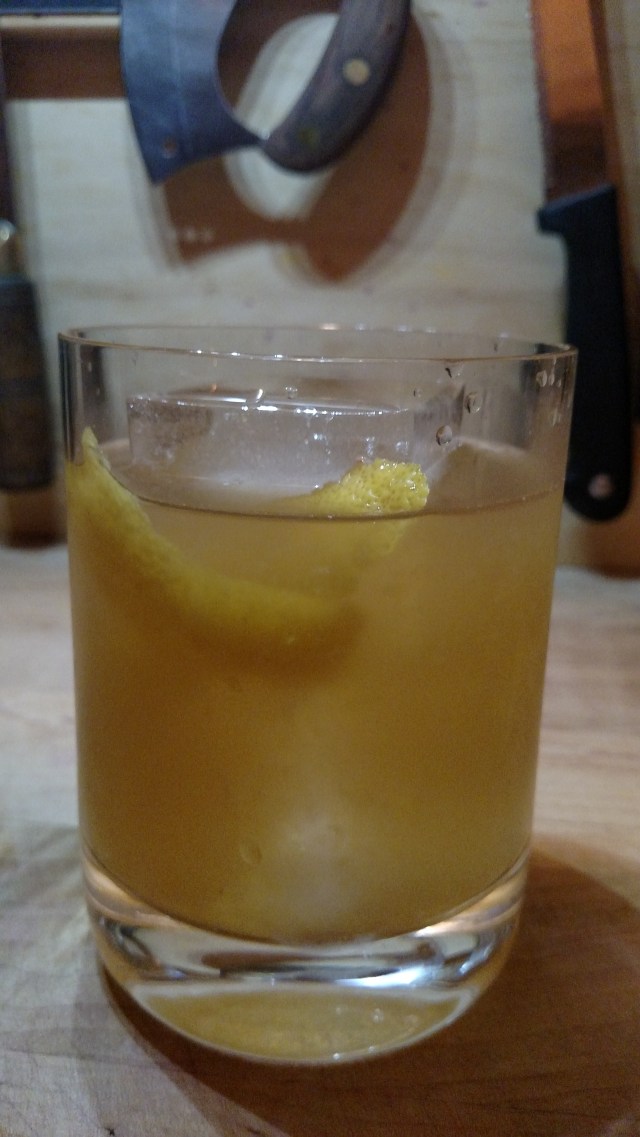Stroke the rim of the old fashioned glass with the lemon zest (skin without the white pith), then drop the zest in the glass. Stir your cocktail until a bit of the water from the ice dilutes this slightly.