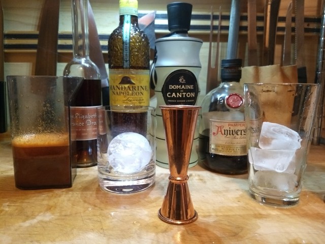 Shake over ice and strain into a doubles glass with a fancy ice globe. Garnish with blackstrap bitters.